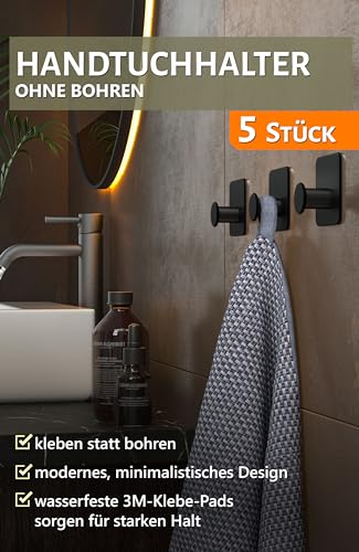 4smile Handtuchhalter ohne Bohren – 5 Stück Handtuchhaken Bad, schwarze Klebehaken modern, stilvoll – Haken selbstklebend extra-stark mit 3M-Klebe-Pads, Wandhaken