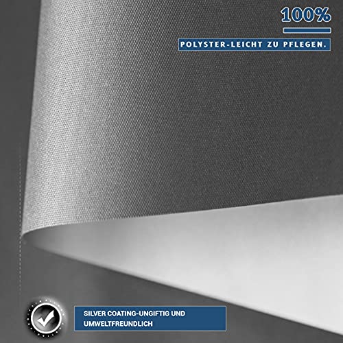 Material : Verdunkelungsrollo ist aus widerstandsfähigem, lichtundurchlässigen 100 % Polyester mit silberfarbend Lichtstop Beschichtung auf Rückseite. OEKO-TEX Zertifikat, ungiftig und harmlos