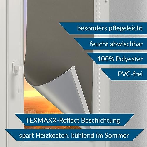 TEXMAXX® Reflect Verdunklungsrollo ohne Bohren – 45 x 160cm (Stoffbreite 41cm) / Thermo Rollos für Fenster ohne Bohren/Fensterrollo innen ohne Bohren/Thermorollo ohne Bohren inkl. Zubehör – Grau