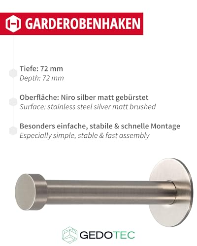 Gedotec Garderobenhaken Edelstahl Kleiderhaken Tür – Garderobe & Wand-Montage – UP-25 | Tiefe: 72 mm | Edelstahl matt gebürstet | Haken für verdeckte Befestigung | 1 Stück – Wandhaken mit Schrauben