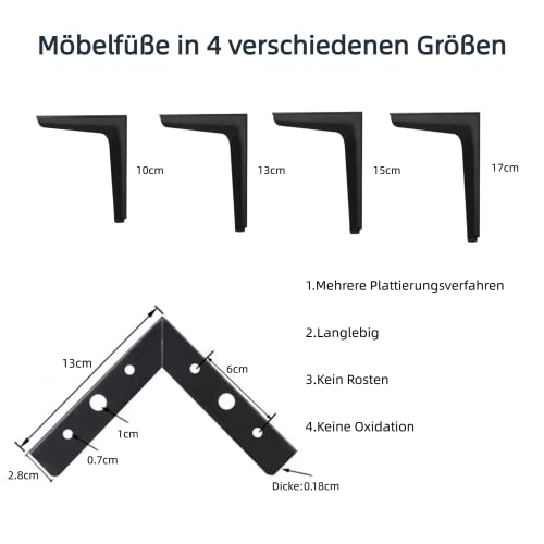 Hochwertiges Material:Die Möbelfüße Schwarz sind aus hochwertigem Metalleisen gefertigt,das stabil und verschleißfest,korrosionsbeständig und rostfrei ist,sich nicht verfärbt und eine lange Lebensdauer hat.Glatt und leicht zu reinigen.Hohe Tragfähigkeit,Schwerlastmöbel mit einer hohen Tragfähigkeit von ca.800 kg bei 4 Möbelfüßen.Produktgröße:10/13/15/17cm,Dicke 1.8mm,Hinweis:Vierer-Set in der gleichen Größe.
