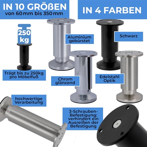 Stahlia Möbelfüße verstellbar (4er Set) 18cm Höhe Edelstahl Optik Ø 38mm Aluminium Schrankfüsse belastbar bis 250Kg Sofa Füße Möbelbeine Metallfüße Regalfüße