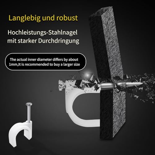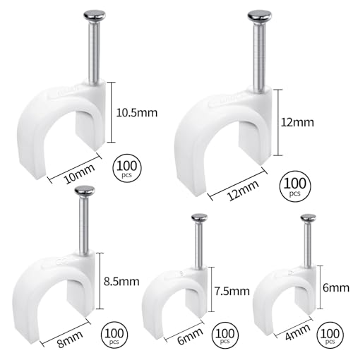 🔨【5 Schwarz Größen Kabelorganisationsset】 Dieses Set enthält 500 Stück 5 Weiß Größen Kabelschellen, Nagelschellen und Kabelklemmen, die speziell für die Befestigung von Kabeln mit einem Durchmesser von 4mm 100pcs , 6mm 100pcs , 8mm 100pcs , 10mm 100pcs , 12mm 100pcs entwickelt wurden. Kabelklemmen sind ideal für die saubere Befestigung von Kabeln an Wänden.