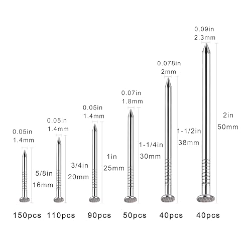 Verschiedene Größen: Paket enthält sechs Größen (2″, 1-1/2″, 1-1/4″, 1″, 3/4″, 5/8″) von rostfreien Nägeln, mit 480pcs Nägeln in jedem Kit, um Ihren täglichen Bedarf zu erfüllen.