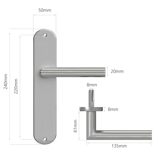 ➤ Rostfreier Edelstahl mit matt-silberner Oberfläche 1 Zimmertür-Beschläge: Maße Beschläge (H x B): 240 x 50 mm, Klinken (L x Ø): 135 x 19 mm, Abstand Klinken zu Tür: 61 mm,