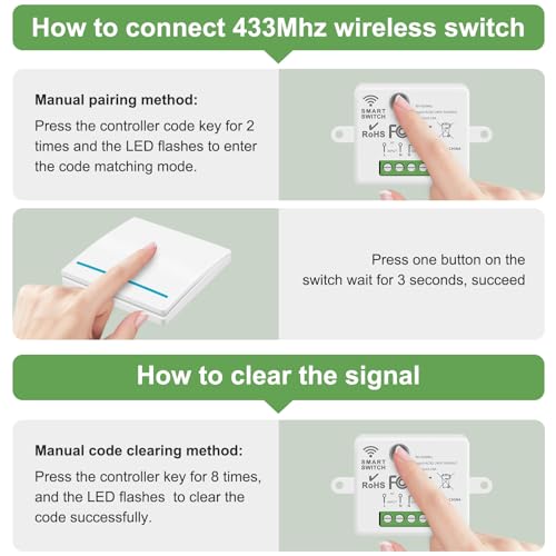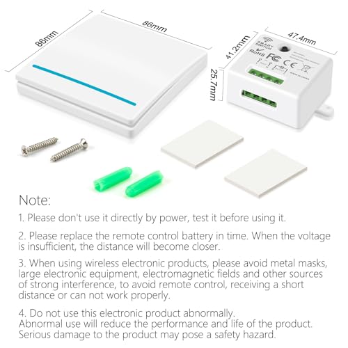 Spezifikationen: Controller Arbeitsspannung: AC85-240V 60HZ/50HZ, Arbeitsfrequenz: 433MHZ. Funklichtschalter Arbeitsspannung: DC3.0V, Arbeitsfrequenz: 433MHZ. rf Funklichtschalter verwendet CR2032 Knopfbatterie.