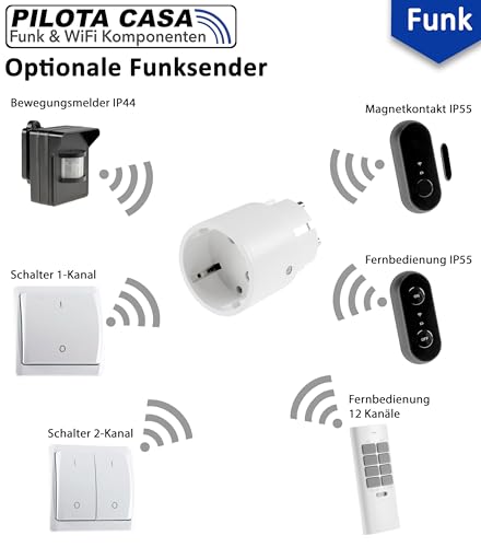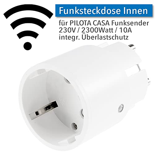FUNKSTEUERUNG – Funk Steckdose für Innen mit hoher Reichweite von bis zu 70m für die Pilota Casa Serie. Slimline Format für einfache und platzsparende Nutzung in Haus und Wohnung. Das Steckdosenset benötigt zusätzlich einen Funksender oder Fernbedienung zum Schalten.