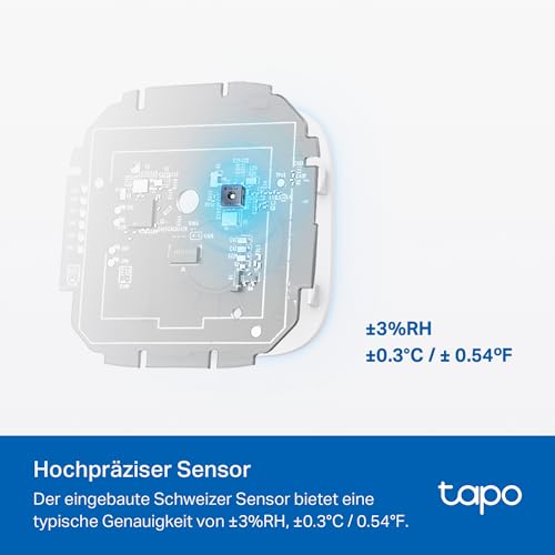 Hochpräziser Sensor – der in der Schweiz hergestellte Sensor bietet eine Genauigkeit von ±0,54 ºF/±0,3 ºC, ±3% RH. Durch den Erhalt und die Aktualisierung der Daten alle 2 Sekunden, der Sensor gibt Ihnen genaue aktuelle Informationen. (der Bildschirm zeigt nur die Temperatur von 0 bis 50 ℃,32 bis 122℉), wenn der Messwert über den Bereich hinausgeht, können Sie Daten auf der Tapo APP lesen.