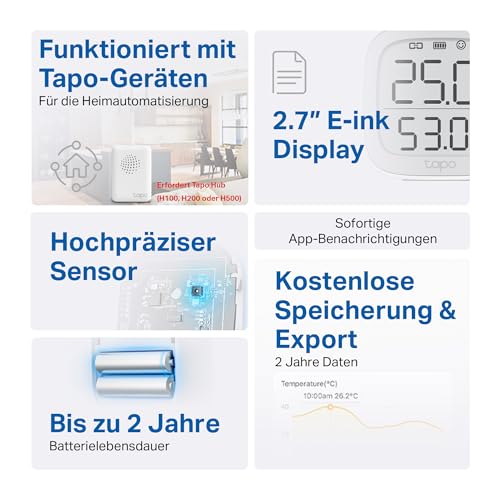 Hub erforderlich – Dieses Produkt kann ohne Hub verwendet werden, aber um Zugang zu intelligenten Funktionen wie Fernüberwachung, Hausautomatisierung, Datenexport und mehr zu erhalten, ist der IoT-Hub Tapo H100 erforderlich.