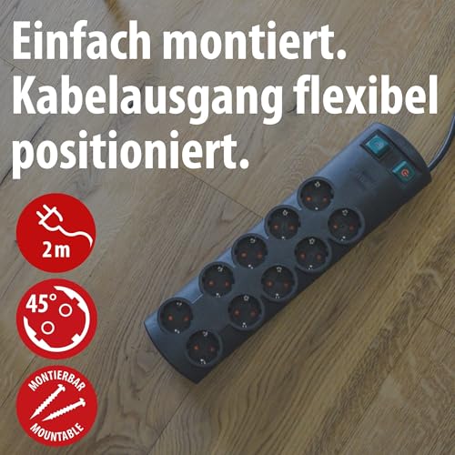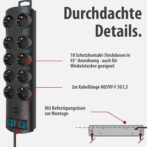 Steckdosenleiste mit 10 Steckdosen (2x 5-fach schaltbare Steckdosen) in praktischer 45°-Anordnung für eine platzsparende Steckeranordnung