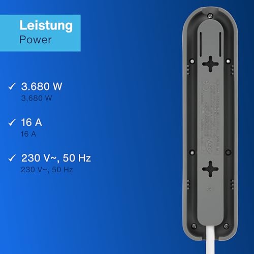 Die Mehrfachsteckdosenleiste hat ein formschönes Design und durch die Zweifarbigkeit eine edle Optik. Der beleuchtete Schalter ist 2-polig. Auf der Rückseite befinden sich verdeckte Befestigungsösen