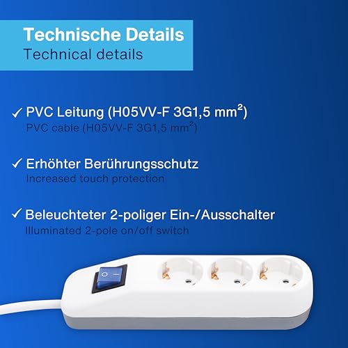 Technische Details der 3fach Steckdose: Zuleitung H05VV-F 3G1,5mm², Kabellänge 1,4m, 230V~,50Hz, 16A, max. 3680W. Abmessungen (BxHxT): 253x60x105mm, Farbe weiss