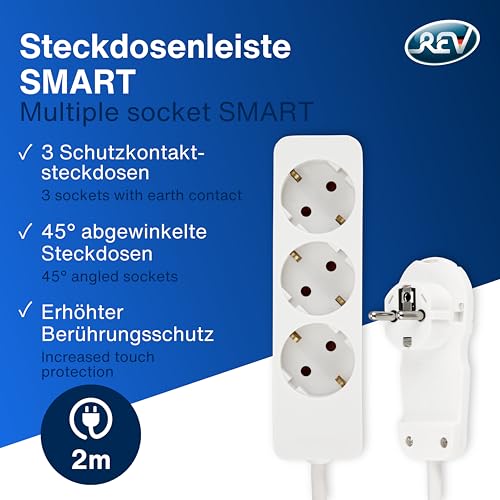 REV Steckdosenleiste SMART – Mehrfachsteckdose 3-Fach mit Flachstecker – ideal für die Verwendung hinter Möbel, Kabel 2m, max. 3680W, weiß