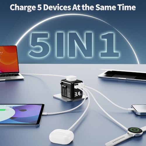 [5-in-1 Reisestecker] Dieser travel adapter verfügt über 2 USB-A-, 2 USB-C-Anschlüsse und 1 AC-Steckdose und lädt bis zu 5 Geräte gleichzeitig. Mit 5V 3.4A/17W ist er ideal für Smartphone, Tablet, Kopfhörer & mehr – alles in einem kompakten Ladegerät