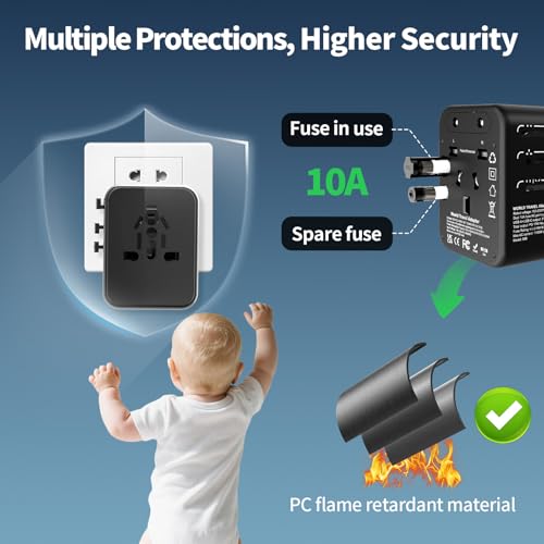 [Duale Sicherung] Der reisestecker bietet mit zwei 10A-Sicherungen und einem flammresistenten PC-Gehäuse zuverlässigen Schutz vor Kurzschlüssen und Überhitzung. Die Stromzufuhr wird bei Störungen automatisch unterbrochen – für sicheres Reisen