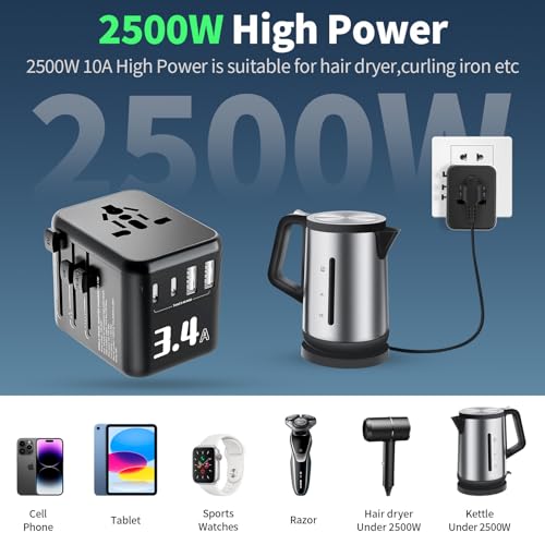 [2500W Hochleistungsadapter] Unser Adapter unterstützt 1100–2500 W und eignet sich perfekt für Haartrockner, Lockenstäbe und Wasserkocher – ideal für Reisen und Geschäftsreisen, kein zusätzlicher ladegerät erforderlich