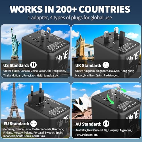 [Ein Adapter, unendliche Reisen] Diese reiseadapter unterstützt Steckerstandards für USA, UK, EU und Australien und ist in über 200 Ländern nutzbar – z. B. in Großbritannien, den USA, Japan und Australien. Mit nur 120 g ist er leicht, handlich und perfekt für jede Reise. Strom überall und jederzeit