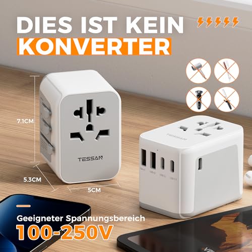 TESSAN Universal Reiseadapter: Dieser Reiseadapter weltweit hat einen EU, UK, AU, US Stecker. Mit diesem travel adapter können Sie in viele Länder reisen, wie Europa, USA, England, Deutschland, Asien, Thailand, Australien, China, Japan, Israel, Italien, Kolumbien usw. Nicht verfügbar in Südafrika und Indien