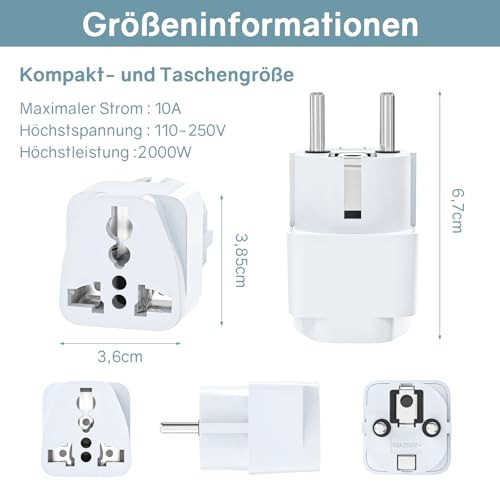 【Breites Anwendungsspektrum】Anschluss externer Geräte eu Sockel Adapter. Der Reiseadapter ist eine ideale Wahl für verschiedene elektronische Geräte, wie Rasierer, Mobiltelefone, Smartphones, E-Reader, Tablets, Laptops usw. Es braucht keine zusätzlichen Adapter und Stecker auf Reisen zu tragen. Ein kleiner World to Europe Steckeradapter kann Ihr Gepäck sparen.