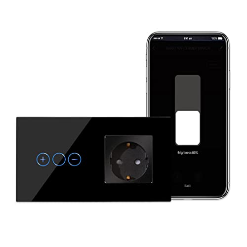 CNBINGO WLAN Dimmschalter mit Schuko Steckdose unterputz – Smart Touch Lichtschalter Arbeit mit Alexa, Google Assistant – Glas Wandschalter Schwarz – Neutralleiter Wird Benötigt