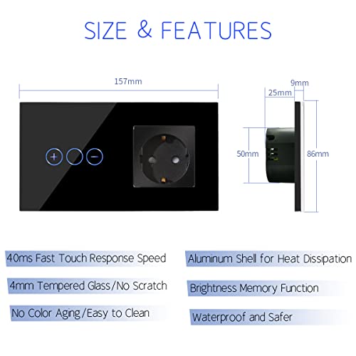 Touch-Panel: 40ms High-Speed-Touch-Antwort. LED-Anzeige zeigt den Status / Aus-Status an. Verwenden Sie eine 4-mm-dicke gehärtete wasserdichte Glasscheibe, die sicherer ist als ein Taster und verhindert den elektrischen Schlag von nassen Händen, der berührt wird. Elektrizität muss während der Installation ausgeschaltet werden. Kann nur die Stromversorgung einschalten, nachdem das Panel installiert ist, oder es funktioniert nicht ordnungsgemäß.