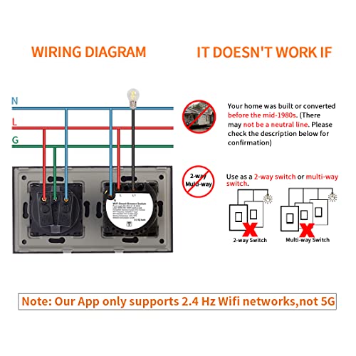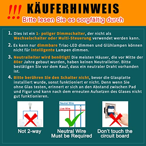 Installation: Neutraler Draht ist erforderlich. Standardgröße, schraubenlose Schnappwandplatte. Das Handbuch leitet Sie durch den VerdrahtungsvorFach und setzt die App ein. Kein Nabe erforderlich, nur für 2,4g Wi-Fi (nicht 5g). Nur 1-Wege-Gebrauch (nicht 2-Wege) .