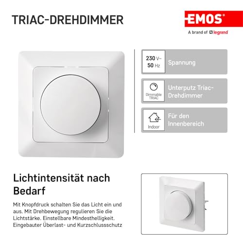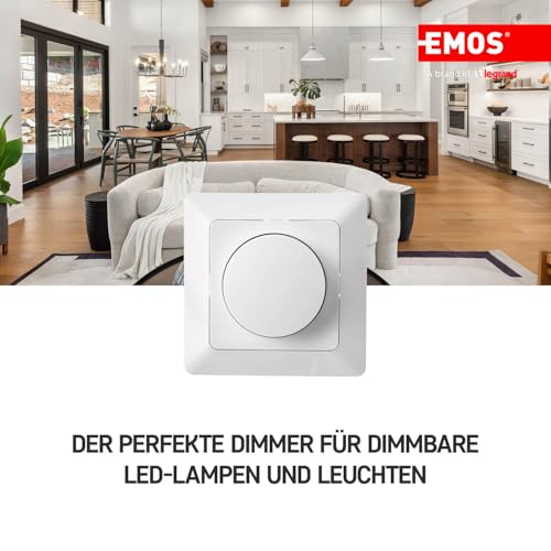 EMOS LED Dimmer mit Drehknopf für LED-Lampen und Halogenlampen, Unterputz Drehdimmer/Dimmschalter, 7-110 W/VA, Weiß
