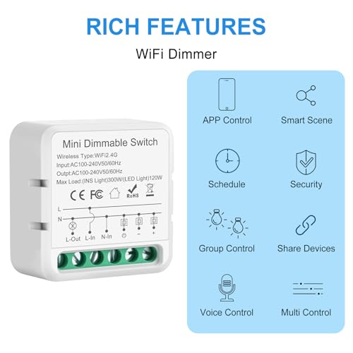 Home Smart Dimmer: Dimmer für led lampen ist kompaktes Design (42*42mm), Dimmer schalter kann unter dem traditionellen Schalter eingebettet werden, macht Ihre Lampe Helligkeit Schalter intelligenter, led dimmer unterstützt WiFi 2.4G, AC100-240V/50-60hz, max. 16A, uni-direktional, neutralen Draht erforderlich.