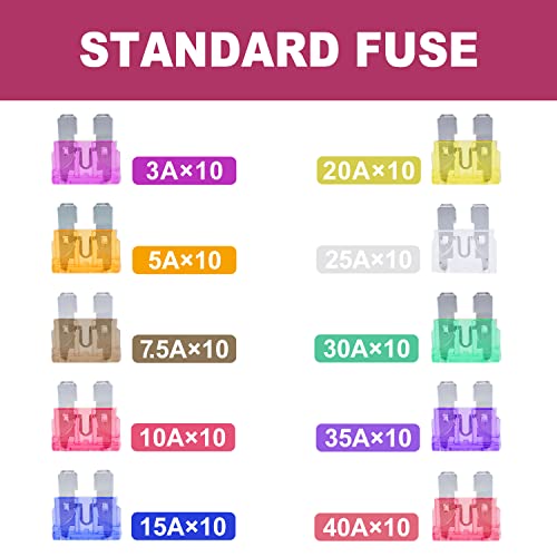 Deckt 10 häufig verwendete Standard Kfz Sicherungen Autosicherungen ab: 3 A/ 5 A/ 7,5 A/ 10 A/ 15 A/ 20 A/ 25 A/ 30 A/ 35 A/40 A (10 Stück pro Modell).