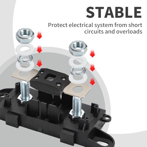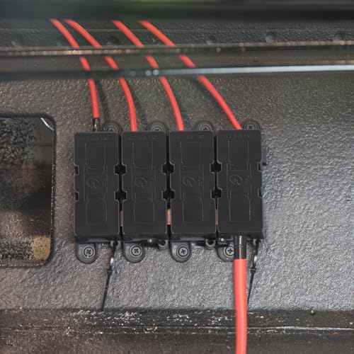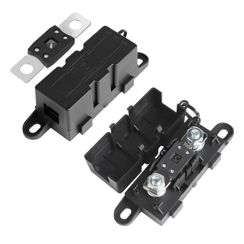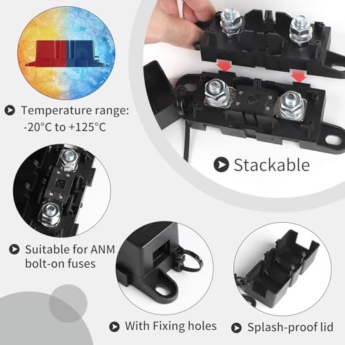 ENTHÄLT – 2 × Hochstrom-Sicherungshalter + 2 × 100 A Mega-Sicherung. Temperaturbereich -20 ℃ bis +125 ℃. Robust, spritzwassergeschützt, einfach zu montieren, schützt die Anschlüsse. Entspricht der Norm UL248.