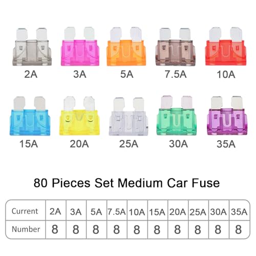 〓 80Pcs Standard-Auto-Sicherungen Set: Mit 2A / 3A / 5A / 7.5A / 10A / 15A / 20A / 25A / 30A / 35A, 8 Stück jedes Modells. Die 10 häufigsten Sicherungen, die alle Ihre Anforderungen erfüllen.