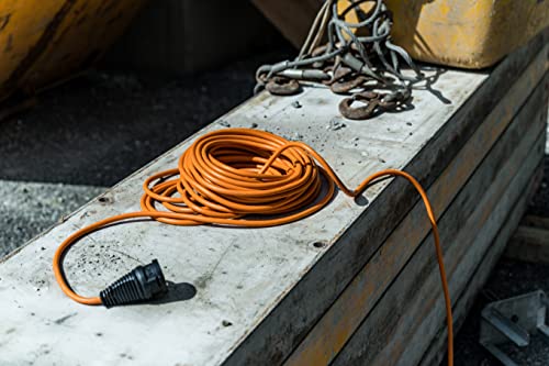 Stromkabel für den kurzfristigen Einsatz im Außenbereich in der Signalfarbe orange mit extra robustem Schutzkontakt-Stecker und -Kupplung mit Verschlusskappe