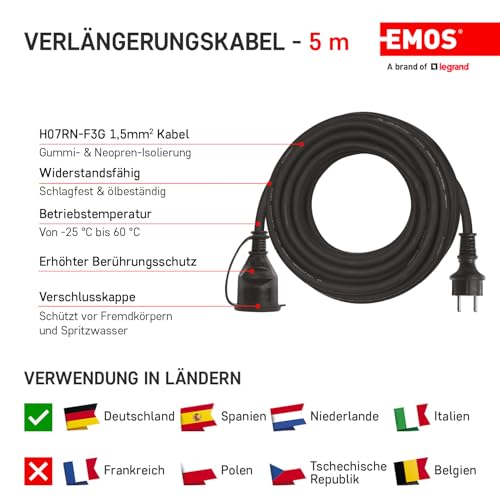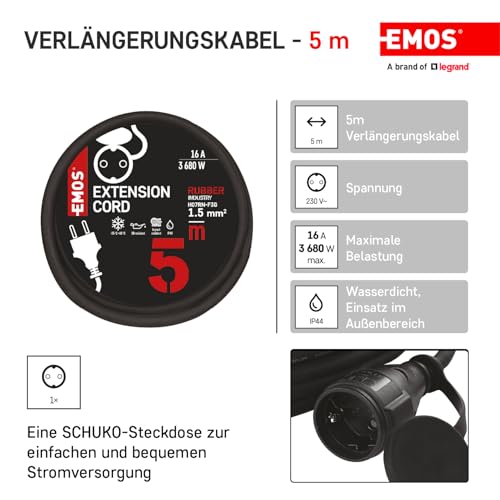 EMOS – IP44 Verlängerungskabel 5m – 1 Schuko-Steckdose – wasserdicht, schlagfest, temperatur- & ölbeständig – 230 V, 16 A, 3680 W – Gummi-Isolierung – H07RN-F3G 1,5 mm2 – für Außenbereich – schwarz