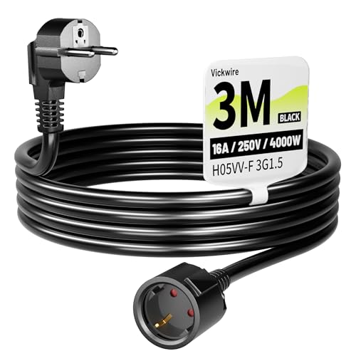 Vickwire Verlängerungskabel 3m Kabel Kabelverlängerungen mit Schutzkontakt Stecker Schuko Verlängerung 16A/250V, Schwarz, H05VV-F 3G1,5 mm²