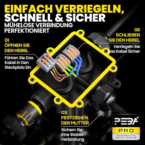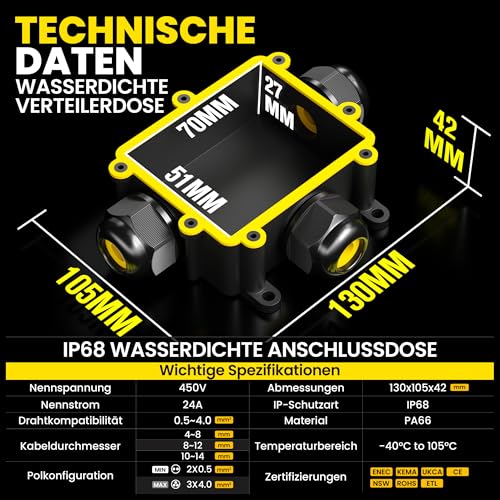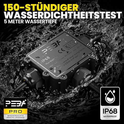 Abzweigdose Wasserdicht: Professionelles wasserdichtes Design, wasserdicht bis IP68 (getestet mit 5 Metern Wassersäule für 150 Stunden), kann bei verschiedenen extremen Wetterbedingungen verwendet werden.