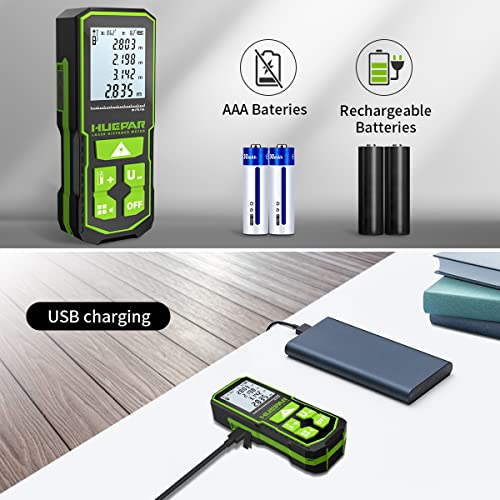 Huepar Laserdistometer 393Ft(120M) mit wiederaufladbaren Akku und Doppelwinkel–Display, Lasermessung M/In/Ft mit Stummmodus & Mehrere Messmodi, Pythagoras, Distanz, Fläche & Volumen–S120