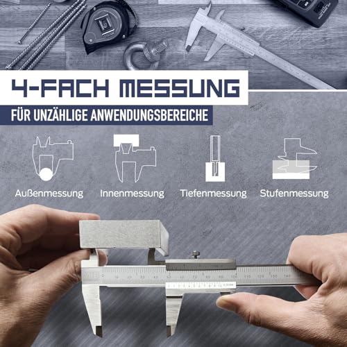 HOCHWERTIGES MATERIAL: Hergestellt aus rostfreiem, gehärtetem Stahl mit mattverchromtem Ablesebereich, ist dieser Messschieber langlebig und widerstandsfähig gegen Verschleiß und Korrosion.