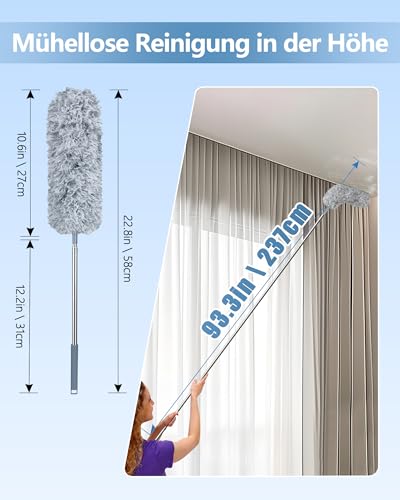 Lange und erweiterbar: Der superlange Teleskopstange kann bis zu 237 cm ausgezogen werden und erreicht hohe Decken, Deckenventilatoren, Jalousien, Spinnweben und andere schwer zugängliche Stellen, was ihn zu einem wertvollen Helfer für die Haushaltsreinigung macht.