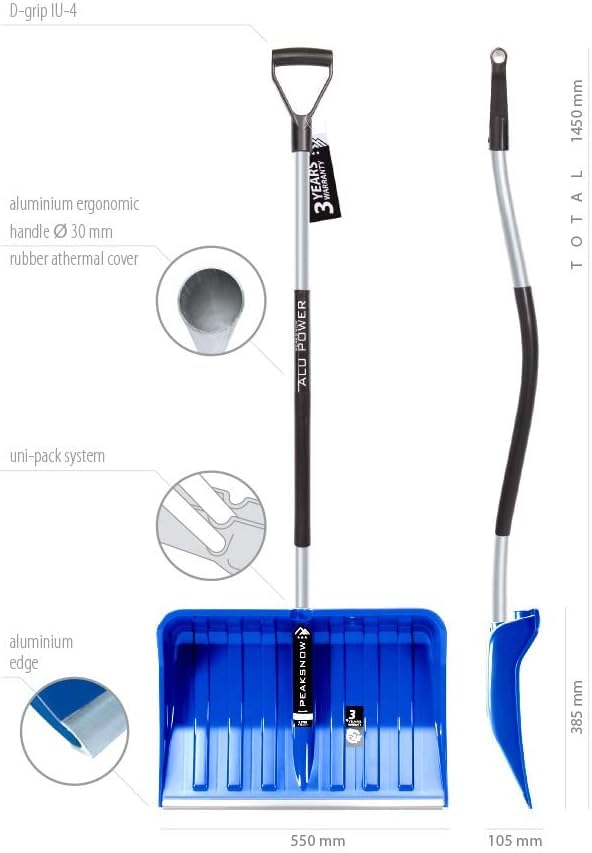 Ergonomische Schneeschaufel – Schneeräumer für kleine und große Schneemengen – Kunststoff-Blatt, Aluminiumkante, Aluminium-Stiel mit separatem Griffbereich