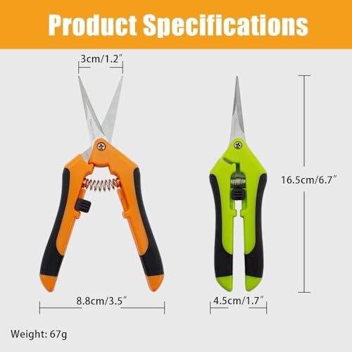 【Value Pack】Dieses Paket enthält 2 Stück Baumscheren, eine grüne und eine orange, für Ihre Arbeit zu Hause oder im Garten. Die Gesamtlänge der Gartenschere beträgt 16,5cm/6,5inch, die Grifflänge 11,5cm/4,5inch und die Klingenlänge 5cm/1,95inch.