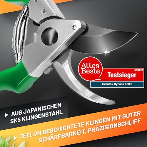 GRÜNTEK Gartenschere FALKE Teflon Baumschere, Klinge aus japanischem SK5 Stahl, Bypass Pflanzenschere 215 mm Secateurs, Ergonomische Garten-Pflanzen-Blumenschere