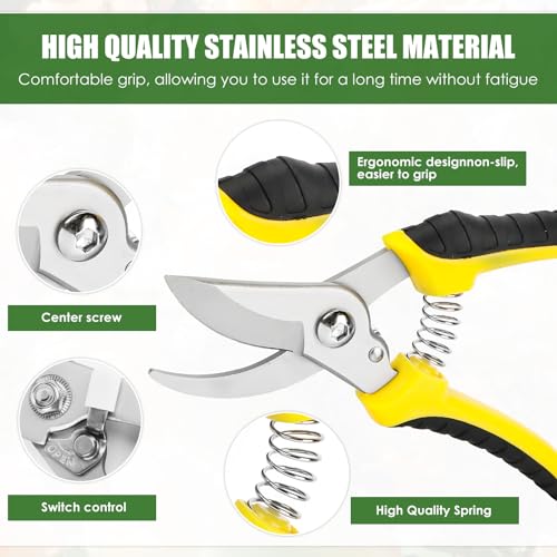 Erleichtern Sie die Schnittarbeit: Die rostbeständigen Edelstahlklingen sind scharf und langlebig für einen einfachen und glatten Schnitt. Der rutschfeste und ergonomische Griff sorgt dafür, dass die Gartenschere bequemer in der Hand liegt. Die leicht zu öffnende Federwirkung verringert die Ermüdung der Hände beim Schneiden. Sie können leicht schneiden, ohne die lebenswichtigen Stängel und Zweige Ihrer Pflanzen zu beschädigen.