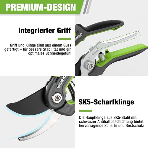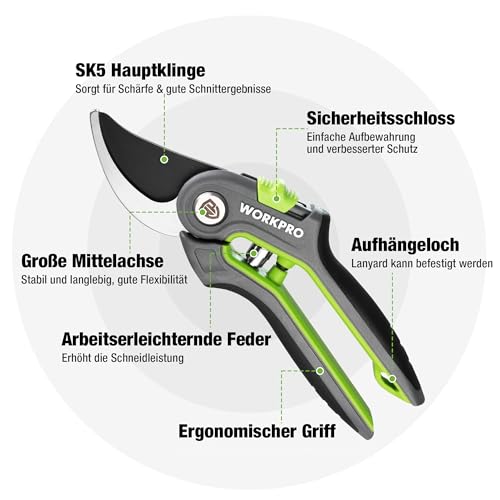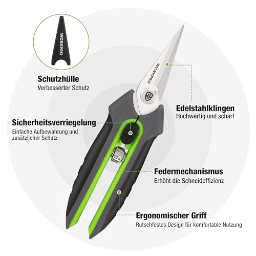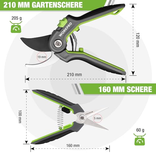 【Ideales Gartenschere Set】 WORKPRO Pflanzenschere Set enthält 1 x Bypass Baumschere und 1 x Ernteschere. Die Bypass Schere eignet sich für Schneiden von frische Zweige ≤19mm, die Ernteschere für Feinarbeiten ≤5mm wie Blumen und Früchte pflücken.