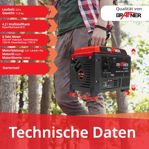 Grafner Inverter Stromerzeuger 1200 W (1,1 KW Dauerleistung), Benzinbetrieb 4 Takt, 1x 230V, Invertertechnologie für empfindliche Geräte, leicht robust, digitaler Benzin Generator Notstrom Aggregat