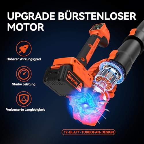 【Überlegene bürstenlose Motorleistung】: Der Bravolu Laubbläser verfügt über einen hocheffizienten bürstenlosen Motor, der bis zu 22.000 U/min erreichen kann. Mit fortschrittlicher Axialventilator-Technologie bietet er ein größeres Luftvolumen und eine verbesserte Wärmeableitung im Vergleich zu herkömmlichen Zentrifugalventilatoren. Mit 12 Turbinenschaufeln und einer Turboladefunktion liefert er eine überlegene Luftstromleistung.