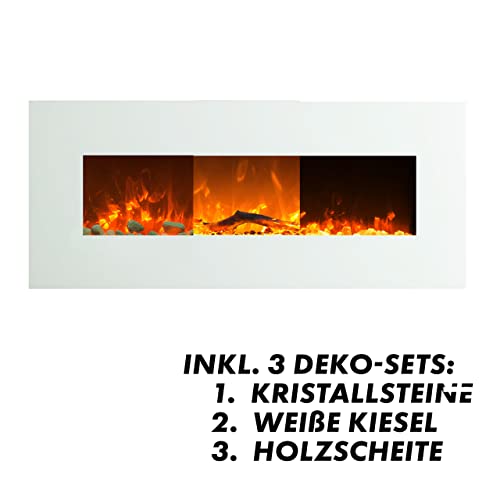 GLOW FIRE Elektrokamin mit Heizung und Kaminfeuer (Wandkamin) – elektrischer Kamin mit LED-Licht, Heizlüfter, Deko & Fernbedienung – zum Aufhängen an der Wand, max. 1500 W – Weiß, 126 cm