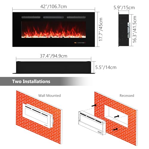 Oxhark Flame Elektrokamin Wandmontage, 13 Farbmodi LED flammeneffekt, 108 cm Kamin Heizung Glas-Touchscreen und Fernbedienung,1500W(42″)