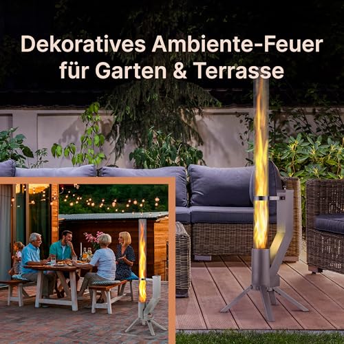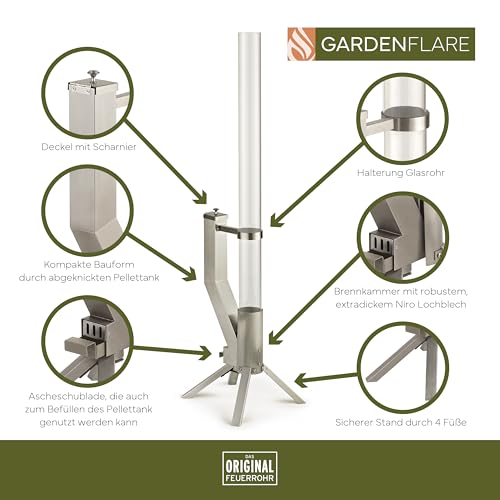 ELEGANTES DESIGN & PREMIUM QUALITÄT: das Gardenflare Feuerrohr Klassik kombiniert stilvolles Design mit Edelstahl und hitzebeständigem Glas. Ideal als Terrassenheizer, Pelletfackel oder Gartenkamin-Ersatz. Langlebig, robust und perfekt für jedes Outdoor-Event.