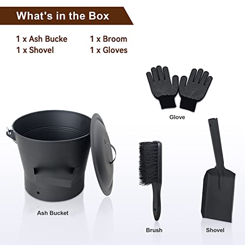BRIAN & DANY Ascheeimer mit Deckel, Runder Kohleeimer für Kamine, 10L Eimer mit Schaufel und Handbesen, Werkzeugset Zubehör für Kamin, Feuerstelle, Holzofen