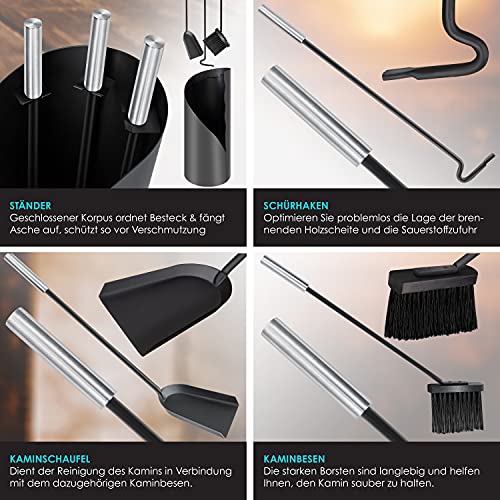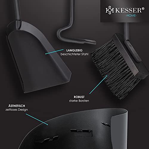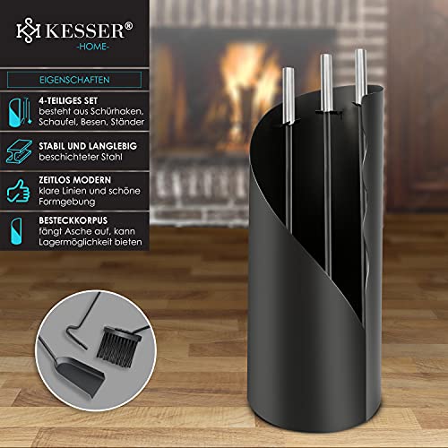 KESSER® Kaminbesteck Set 4-teiliges Kaminzubehör – Modern Design, beschichtet, Hochwertige Kamingarnitur aus 4 Teilen: Besen, Schaufel, Schürhaken, Ständer Stahl Edelstahlgriffe, Schwarz